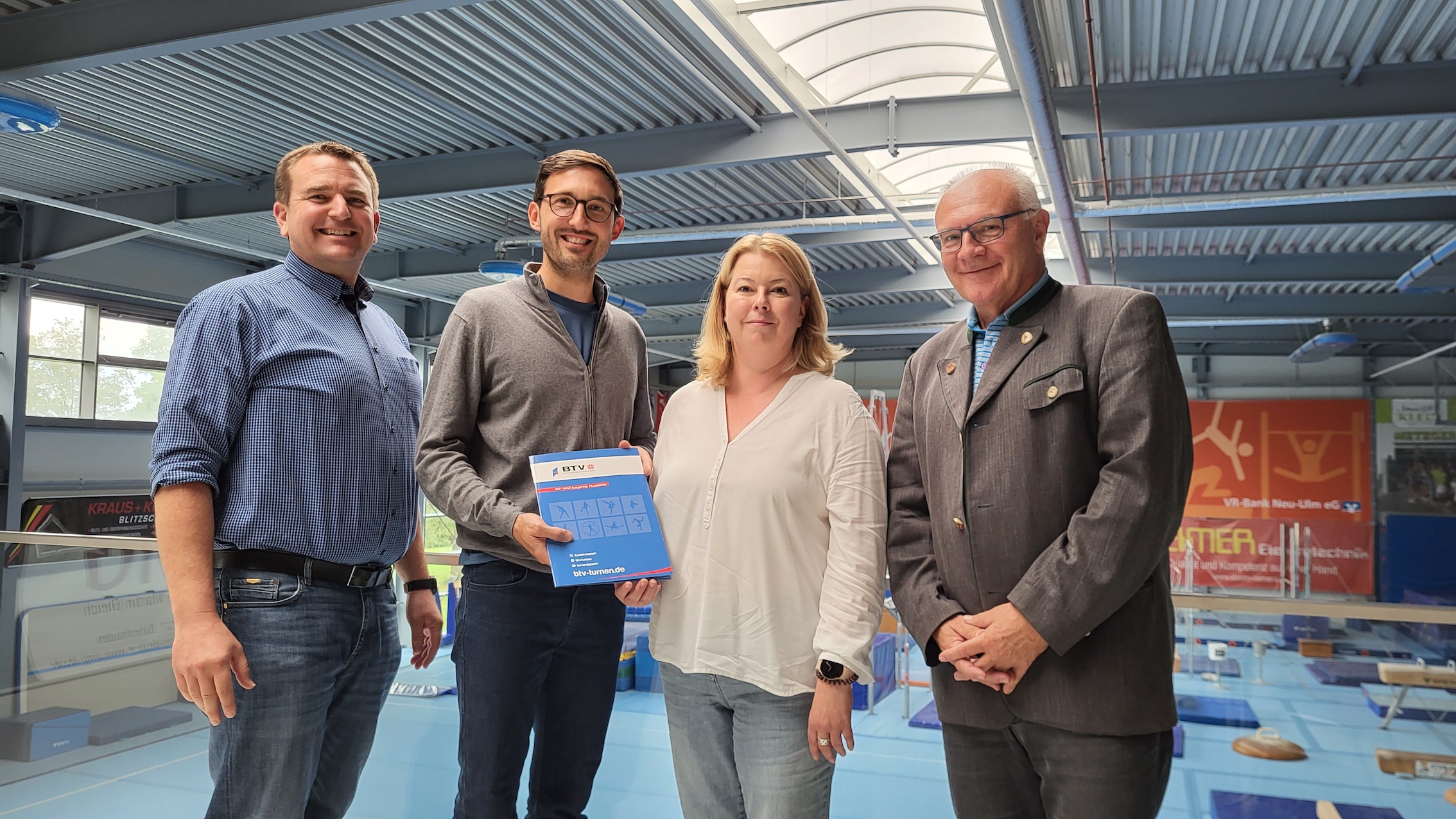 Der TSV-Vorstand zusammen mit dem BTV im Eugen Egle Turnzentrum – Pfuhl (v.l.n.r.): Martin Salzmann, Jürgen Mohn, Kerstin Schilpp (BTV), Johannes Stingl
