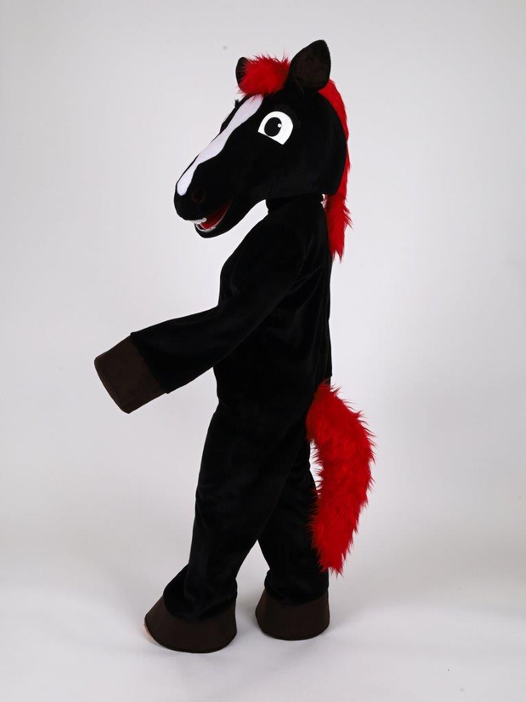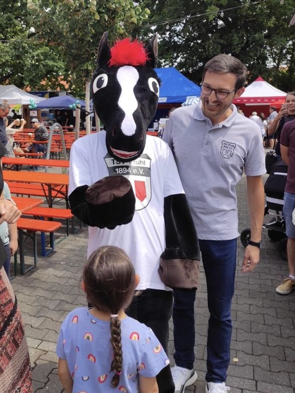 ich bin Rosswettle, das Maskottchen des TSV Pfuhl. Ich bin ein schwarzes Pferd und mein Pony, meine Mähne und mein Schweif sind rot. Seit 2023 unterstütze ich unseren Sportverein, denn mich haben alle 12 Abteilungen gemeinsam zum Leben erweckt. Ich kann zwar nicht sprechen, aber dafür bin ich immer gut gelaunt und für jeden Spaß zu haben. Am liebsten mache ich fleißig Fotos für und mit meinen kleinen Fans. Viele davon sehe ich auf den verschiedenen Aktionen des TSV Pfuhl oder auch auf anderen Veranstaltungen im Ort – das ist wirklich klasse!