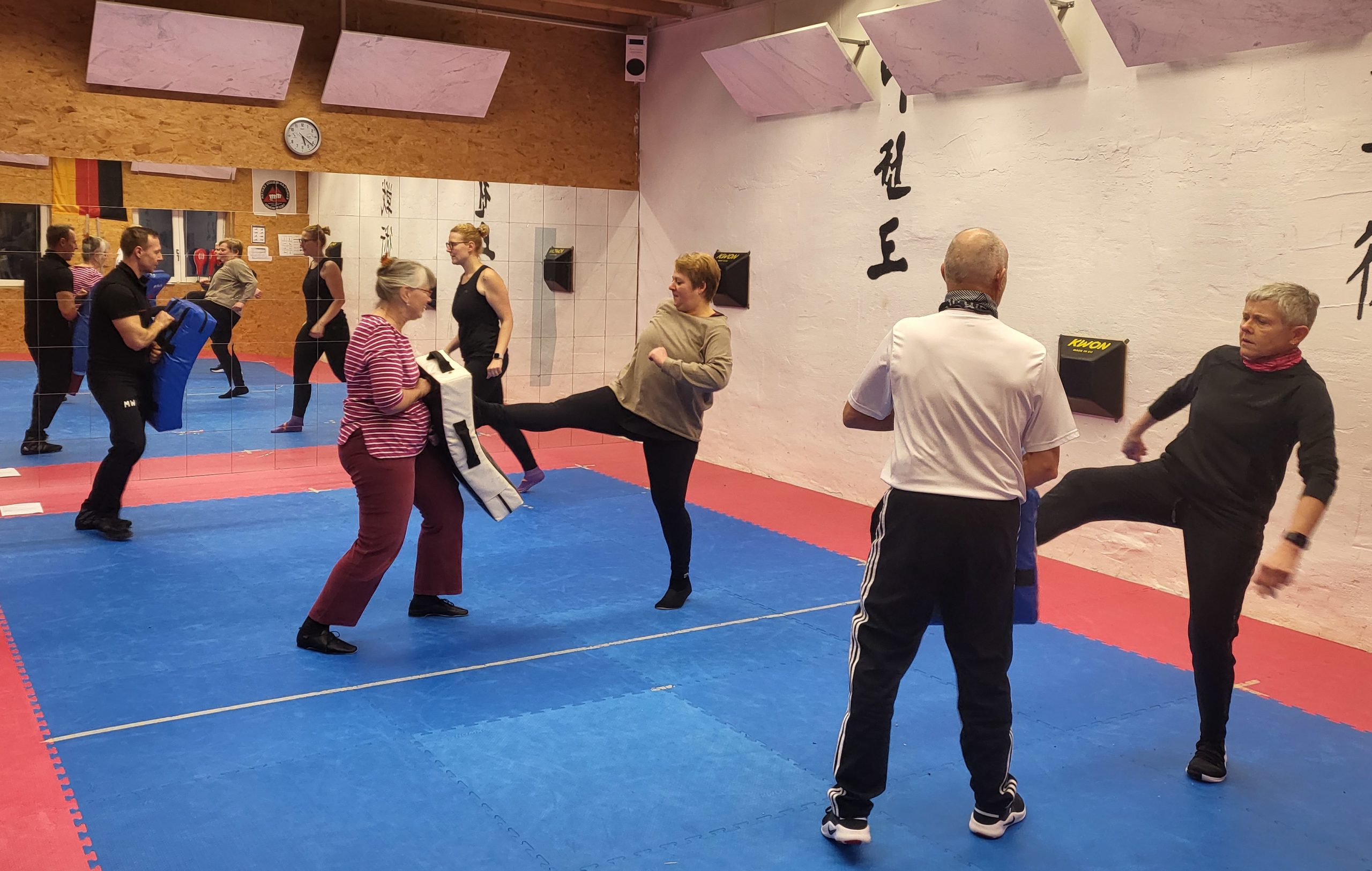 Die Securates-Teilnehmer beim Einüben von Kicks in der Kurseinheit „Fußtechniken“. Links im Bild Michael Wagner, einer der Trainer.