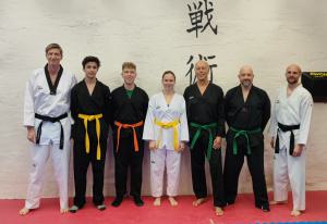 Erfolgreiche Allkampf-Prüflinge mit den Prüfungs-Coaches Christian Kotonski (1.Dan, r.) und Matthias Höllbacher (1.Dan, l.).